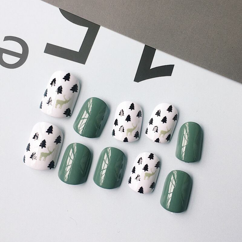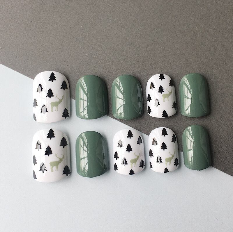 お色がモスグリーンのため、大人向けのシックなクリスマスネイルとなっています。