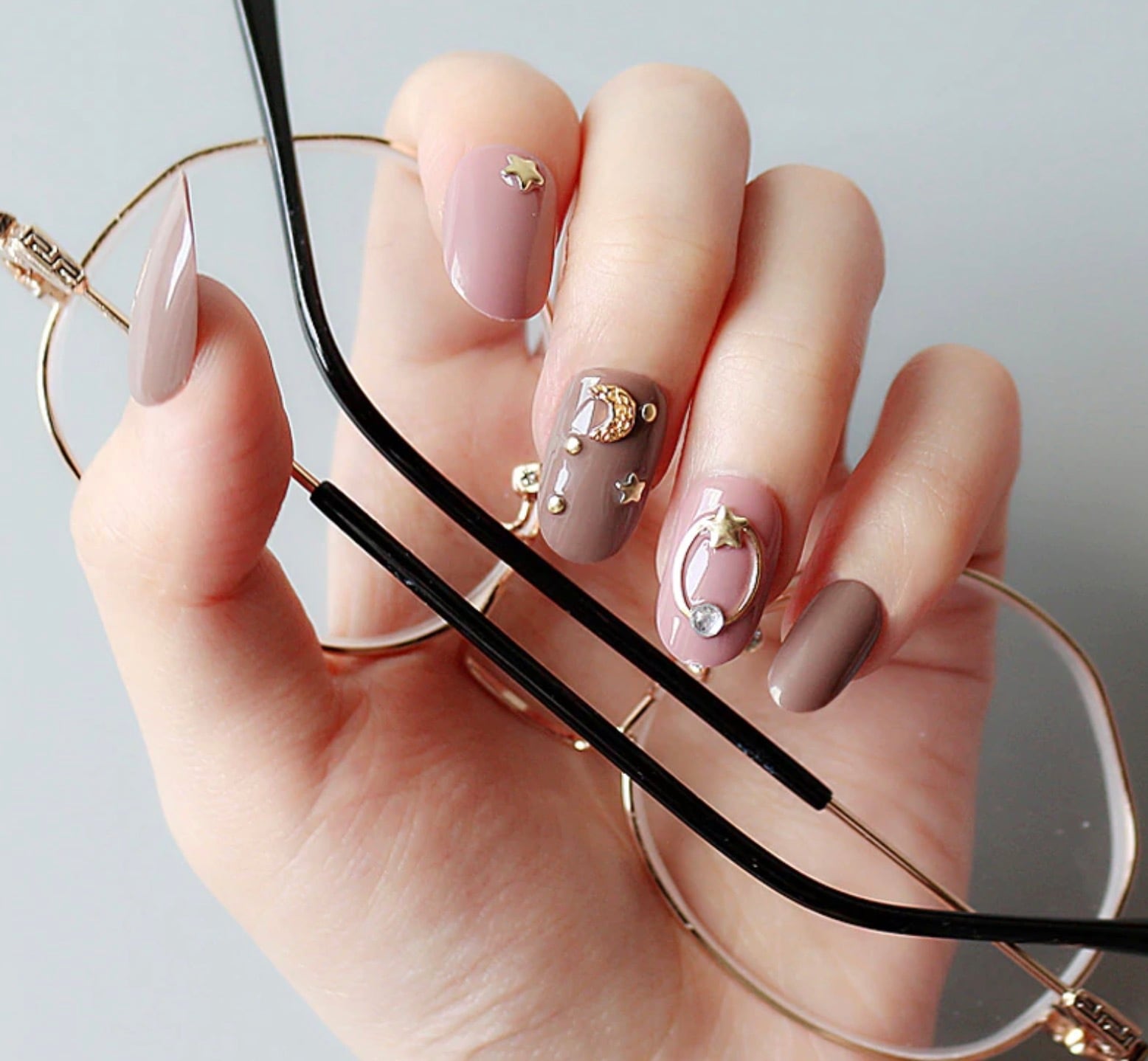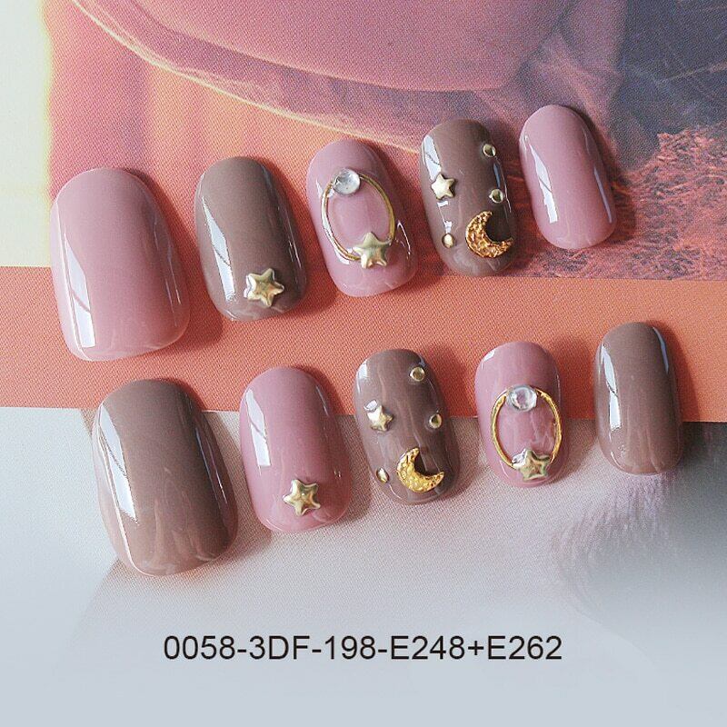 46ピンク、ブラウンお月様とお星様のついた可愛いネイルチップ(46)