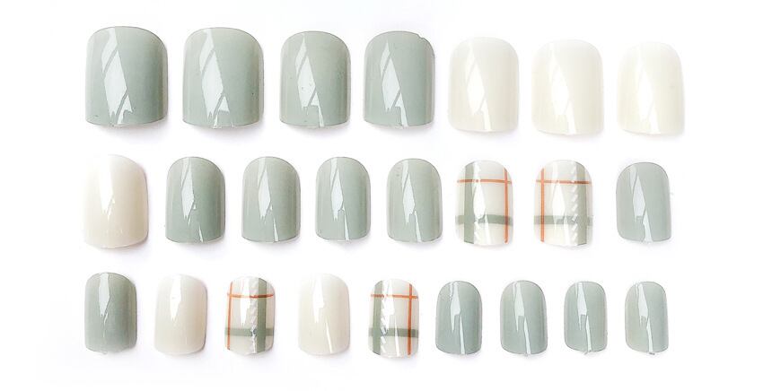 モスグリーンと白のネイルチップに、チェックがデザインされています✨