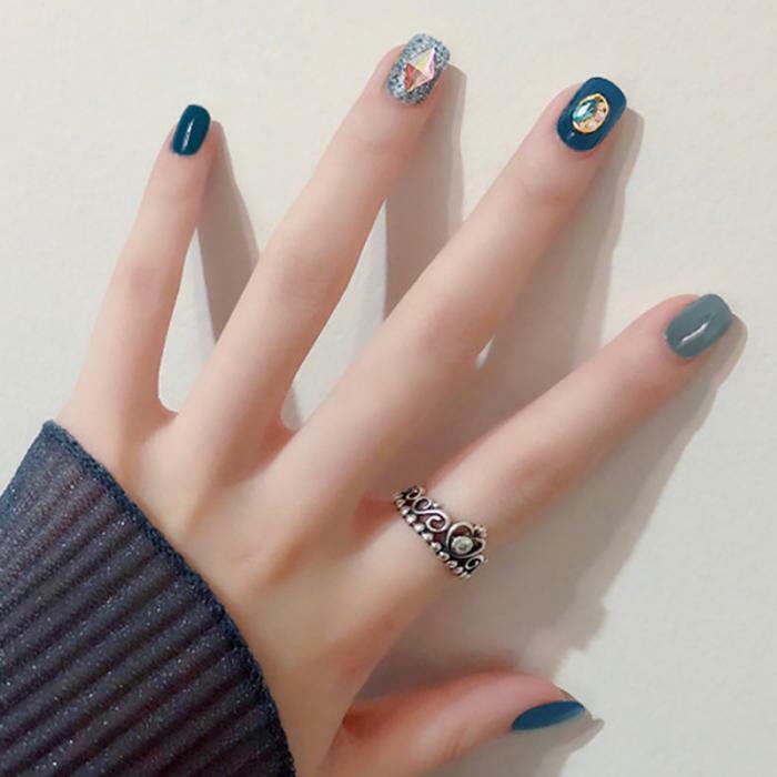くすみコバルトブルーにストーンがついた深い色ネイルチップです。