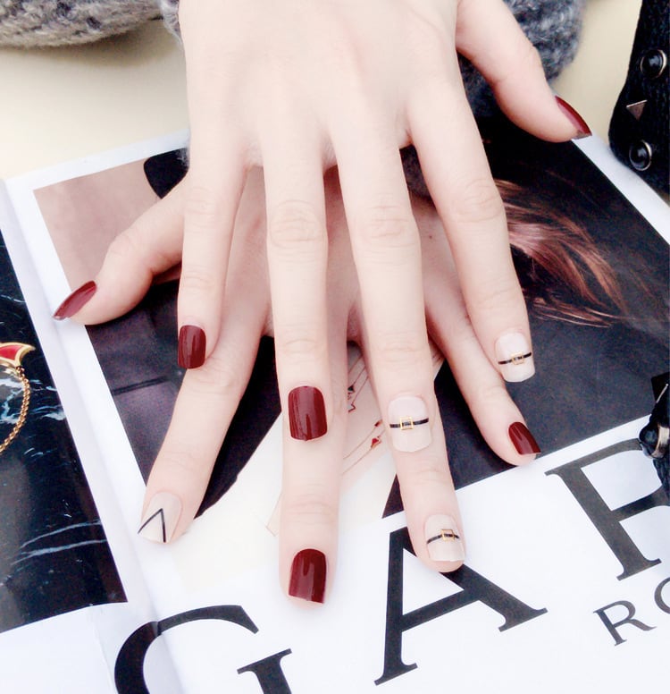 76ボルドーに黒いラインがクールな秋色ネイル✨(76)