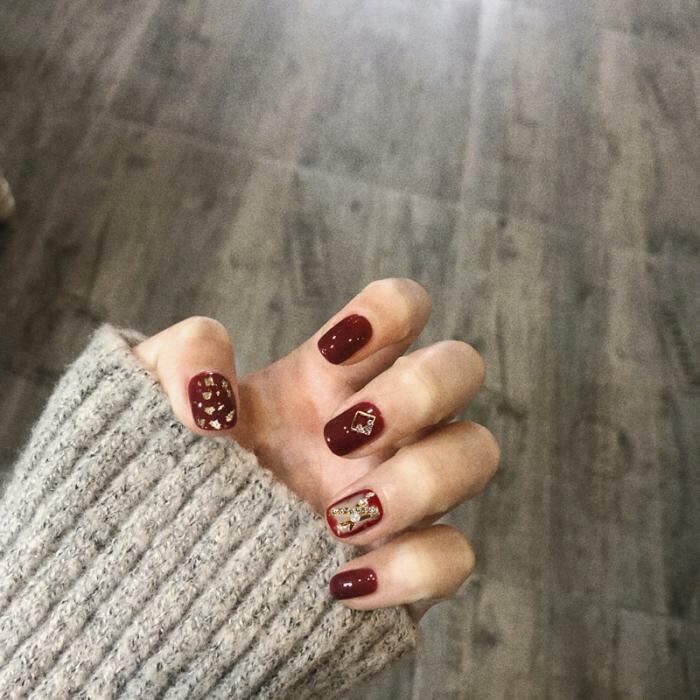 ボルドーに金のラメが華やかな大人なネイルチップです✨