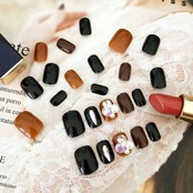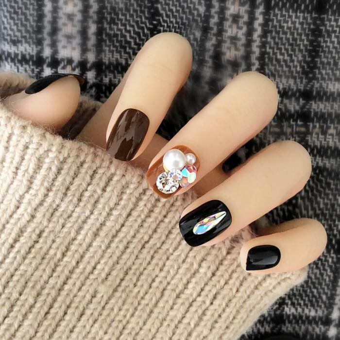 ブラックとブラウンに大きめストーンつきのネイルチップです✨