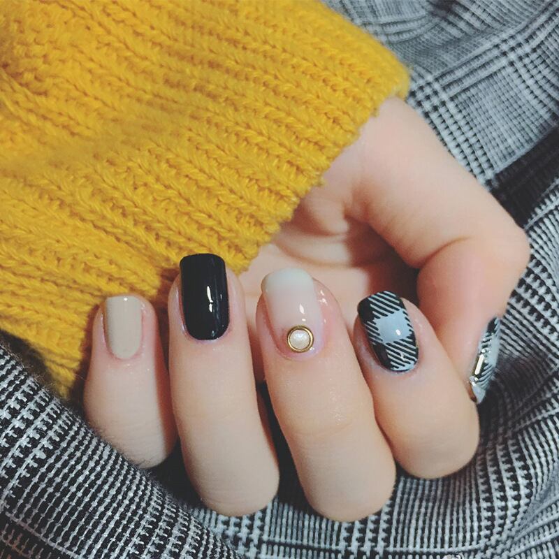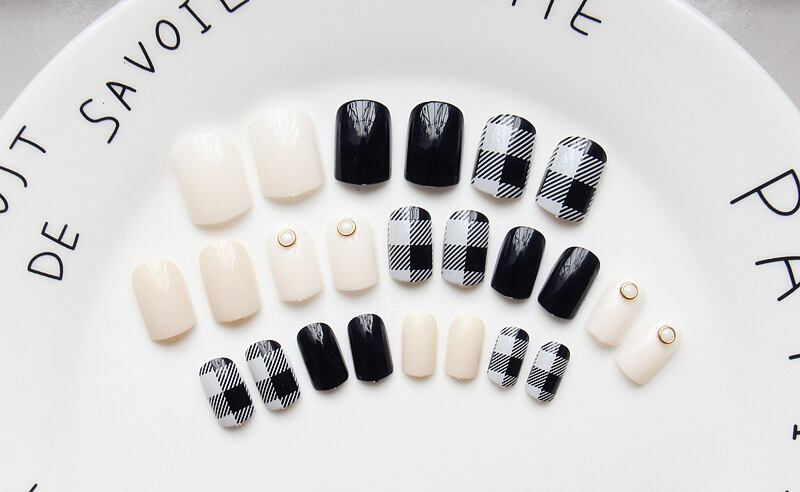 白黒にブルーのチェックが可愛いネイルチップです✨