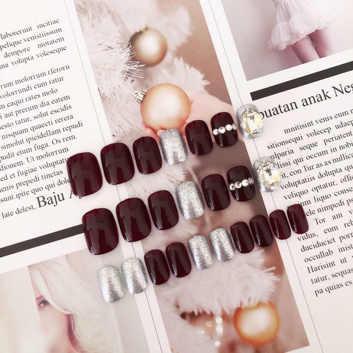122ボルドーにシルバーと大きめストーンが華やかなネイルチップ(122)