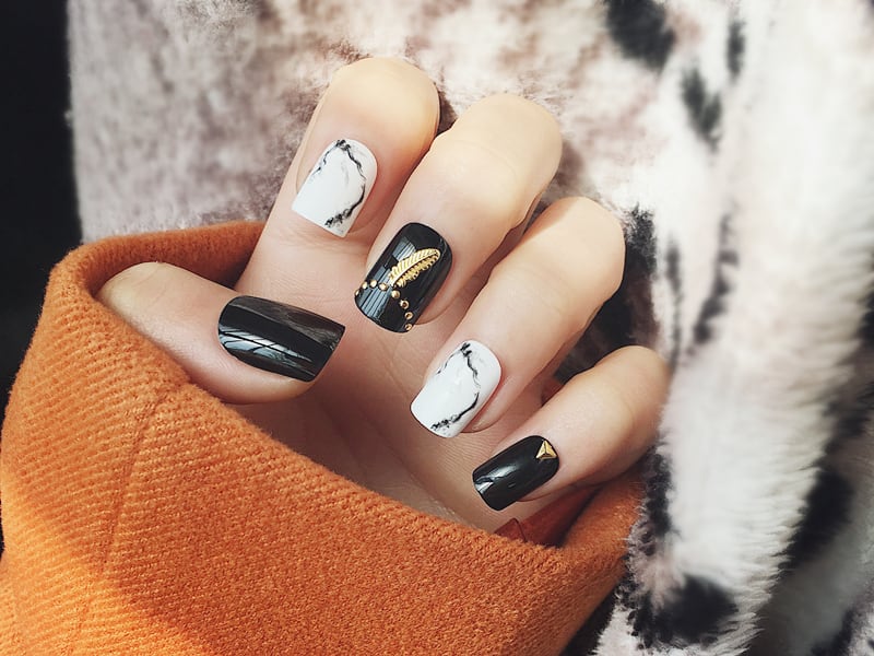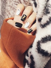 白黒にゴールドで羽のモチーフがついたネイルチップです✨
