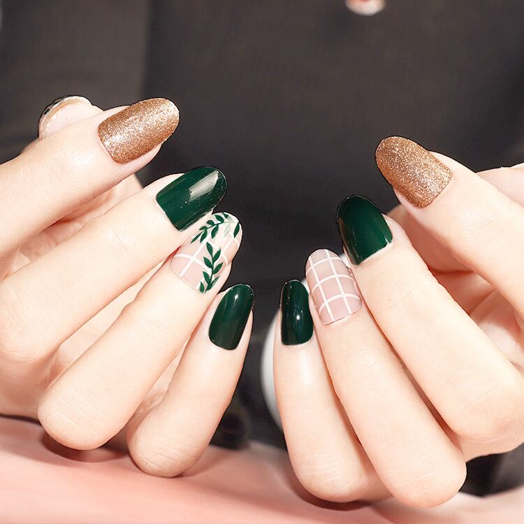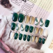 濃いめのグリーンに葉っぱデザインのネイルチップです✨