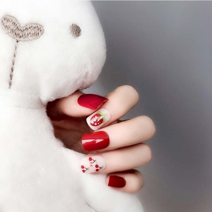 赤にいちごとチェリーが可愛いネイルチップです✨
