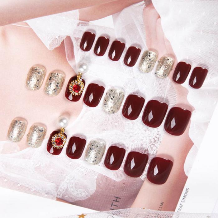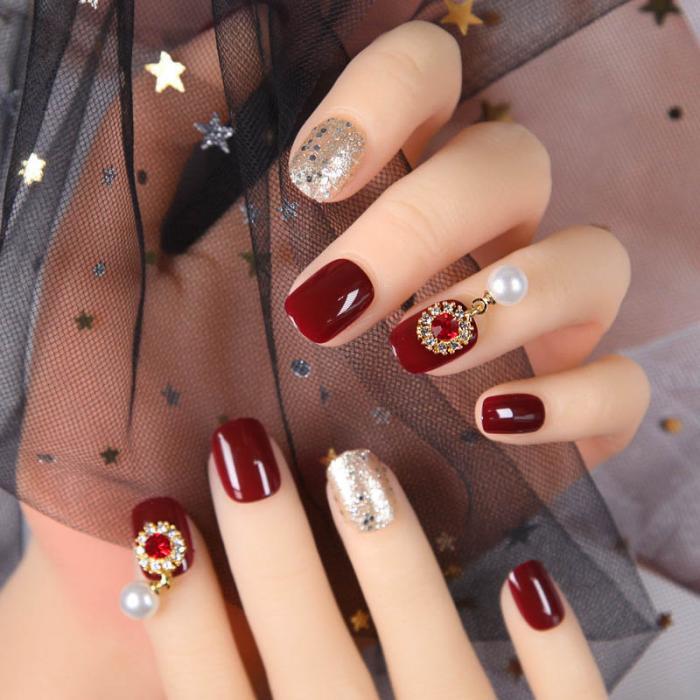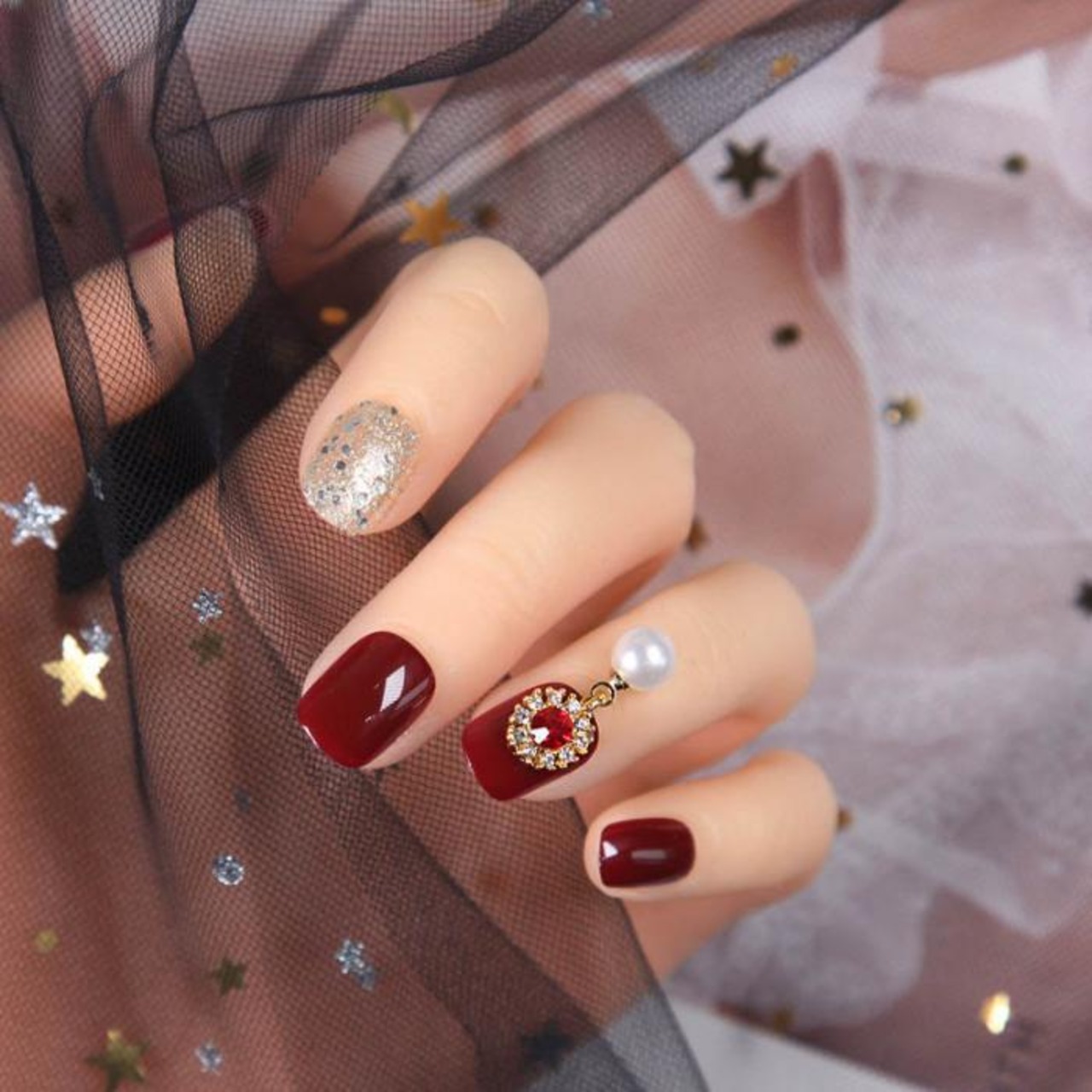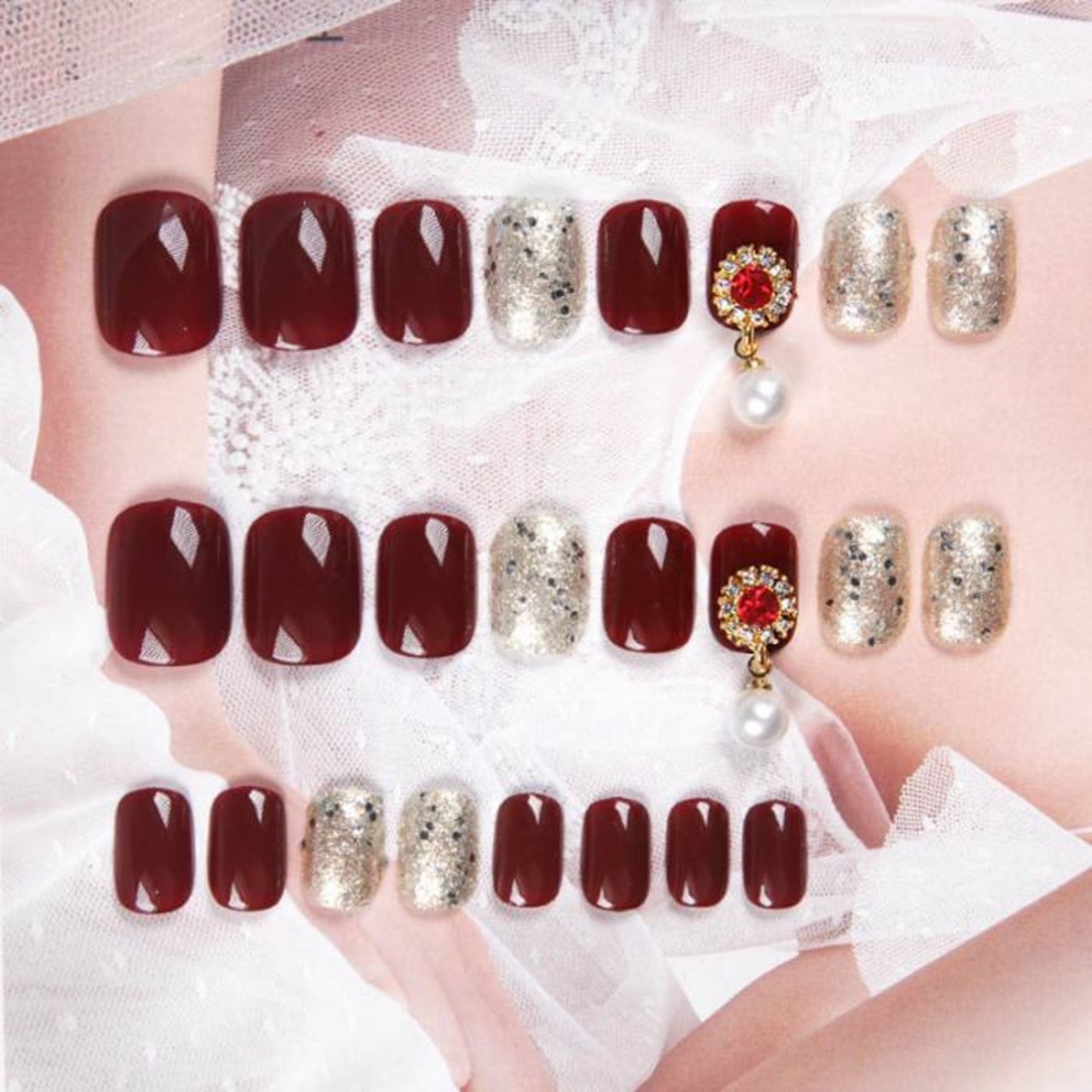 深めの赤にパールとシルバーが艶やかなネイルチップです✨