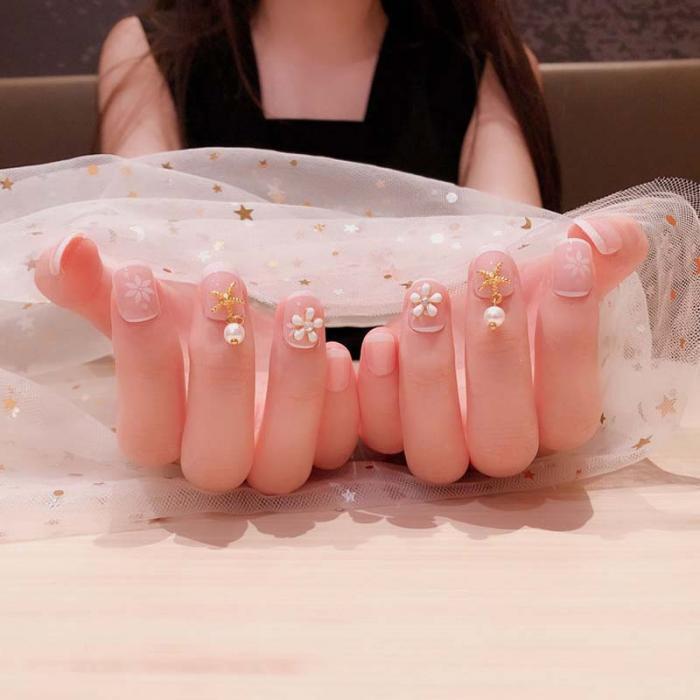 ベビーピンクに白のパールとお星様が素敵なネイルチップ✨