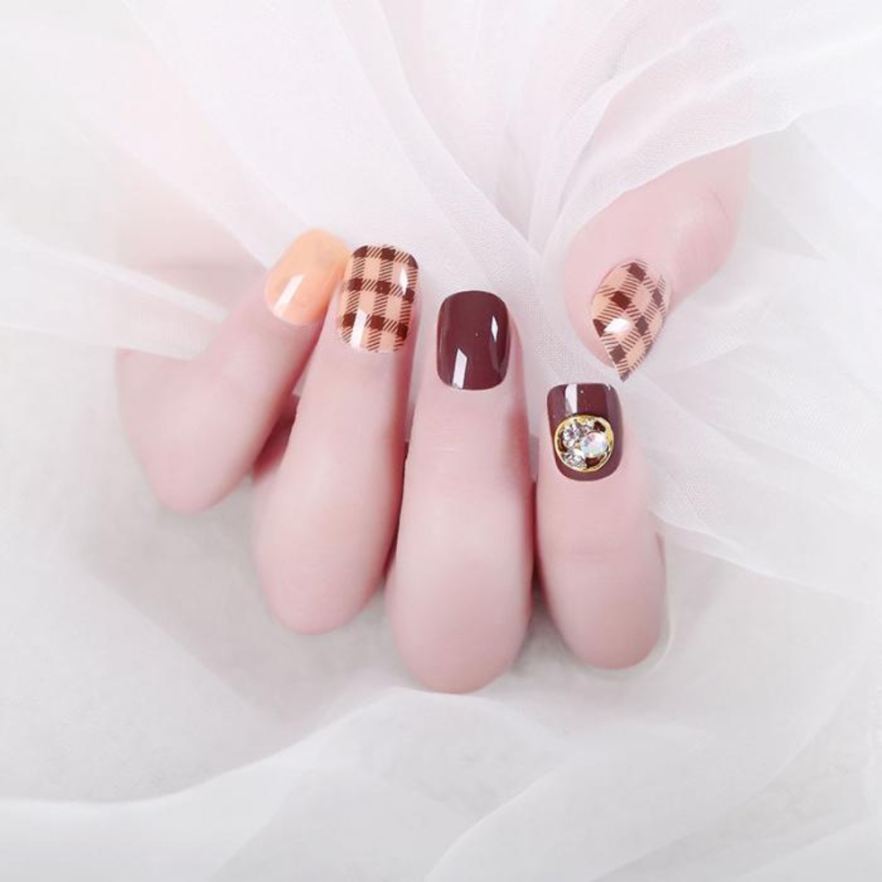 ブラウンにチェックとストーンが可愛いネイルチップです✨