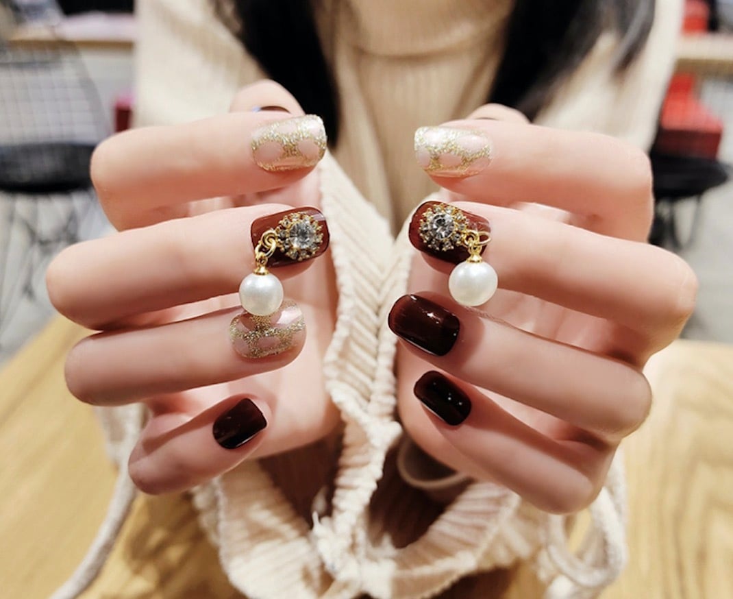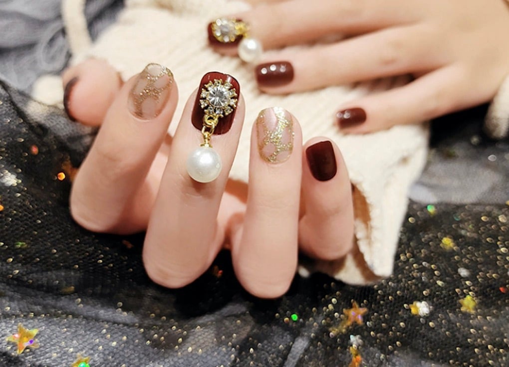 ボルドーにゆれる大きめパールが素敵なネイルチップです✨